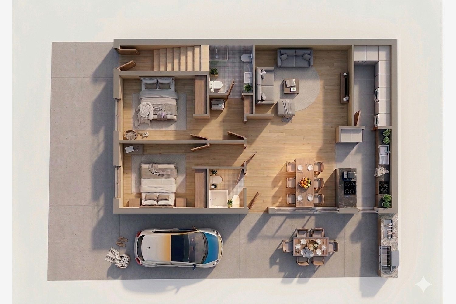 Andar de moradia T2 no Rés do Chão, inserido numa moradia bifamiliar com duas frações independentes, numa zona residencial tranquila de Leça da Palmeira. A área social em open space, que integra sala e cozinha com ilha, prolonga-se naturalmente para o exterior através de um terraço privativo com churrasqueira — um espaço pensado para refeições ao ar livre, convívio e para aproveitar o dia a dia com maior conforto e privacidade. A zona privada inclui 2 quartos, sendo 1 deles suite, e 2 casas de banho, oferecendo uma distribuição funcional e equilibrada, adequada quer para habitação própria, quer para investimento. Pontos-chave: • 2 quartos, sendo 1 suite • 2 casas de banho • Sala e cozinha em open space • Cozinha com ilha • Acesso direto ao terraço • Terraço privativo com churrasqueira Com imagem contemporânea, boa ligação entre interior e exterior e uma tipologia muito procurada, este imóvel reúne características cada vez mais valorizadas numa localização consolidada, com bons acessos e proximidade a vários pontos de interesse. Localização: • MarShopping / IKEA: 7 min • Matosinhos Retail Park: 8 min • Centro de Leça da Palmeira: 4 min • Mercado de Matosinhos: 9 min • Farol de Leça / marginal: 6 min • A28 (acessos): 3 min Peça a brochura, a planta e o mapa de acabamentos. Agende a sua visita e descubra uma solução pensada para viver com mais conforto, luz e espaço exterior em Leça da Palmeira. Conclusão prevista: 1.º trimestre de 2027. Preço: 350.000 € Imagens e plantas 3D meramente ilustrativas e não vinculativas.